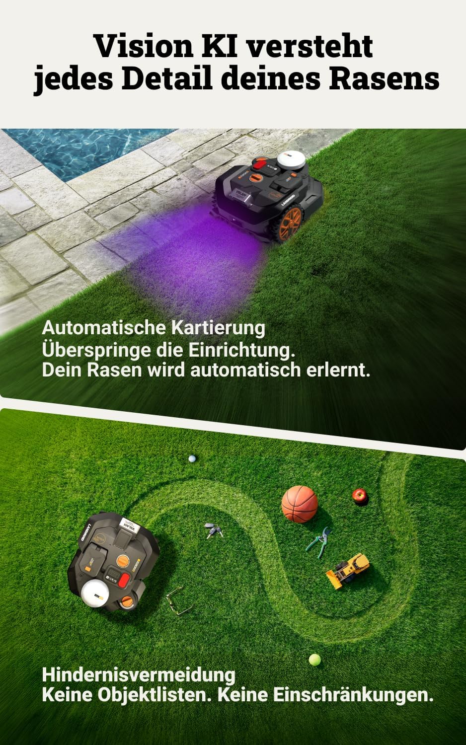 Erleben Sie mühelosen Rasenkomfort mit dem WORX Mähroboter ohne Begrenzungskabel. Ausgestattet mit modernster GPS-RTK-Technologie und intelligenter KI-Navigation, pflegt dieser Rasenroboter Ihren Garten vollautomatisch.